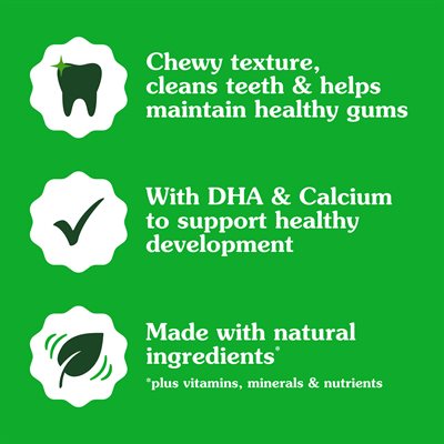 Start your puppy off with a healthy habit by making GREENIES Puppy (6 months and up) Dental Treats a part of their oral care routine. These irresistibly tasty dental treats are easy-to-digest, clean teeth, and have a soft, chewy texture for a more gentle clean. Plus, these teeth-cleaning treats for puppies 5-15 lbs. support healthy development with DHA and calcium.