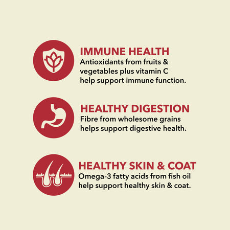 Crafted with 50% premium animal ingredients1 balanced with 50% wholesome grains, vegetables, fruit and nutrients2.