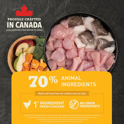 Fresh chicken (18%), chicken meal (18%), whole red lentils, whole green peas, fresh chicken giblets (liver, heart) (7%), chicken fat (7%), turkey meal (4%), fresh eggs (4%), raw hake (4%), herring meal (4%), fish oil (3%), whole green lentils, whole chickpeas, whole yellow peas, lentil fibre, pea starch, raw turkey livers (1%), salt, dried kelp, fresh whole pumpkin, fresh whole butternut squash, fresh whole carrots, fresh whole apples, fresh whole pears, fresh whole zucchini, dried chicory root, fresh kale, fresh spinach, fresh turnip greens, fresh beet greens, whole cranberries, whole blueberries, whole saskatoon berries, turmeric, milk thistle, burdock root, lavender, marshmallow root, rosehips