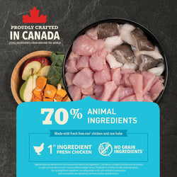 Fresh chicken (18%), chicken meal (18%), whole red lentils, whole green peas, fresh chicken giblets (liver, heart) (7%), chicken fat (7%), turkey meal (4%), fresh eggs (4%), raw hake (4%), herring meal (4%), fish oil (3%), whole green lentils, whole chickpeas, whole yellow peas, lentil fibre, pea starch, raw turkey livers (1%), salt, dried kelp, fresh whole pumpkin, fresh whole butternut squash, fresh whole carrots, fresh whole apples, fresh whole pears, fresh whole zucchini, dried chicory root, fresh kale, fresh spinach, fresh turnip greens, fresh beet greens, whole cranberries, whole blueberries, whole saskatoon berries, turmeric, milk thistle, burdock root, lavender, marshmallow root, rosehips.