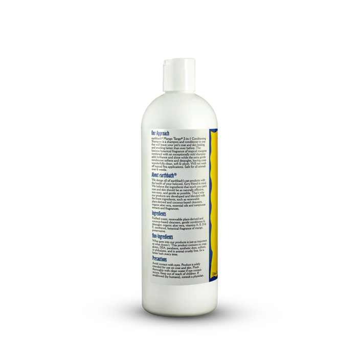 earthbath® Mango Tango® 2-in-1 Conditioning Shampoo is a shampoo and conditioner in one that will leave your pet’s coat and skin looking and smelling better than ever before. The luscious botanical fragrance of tropical mangoes combined with an exceptionally mild shampoo adds brilliance and shine while the extra gentle conditioner softens and detangles, leaving coats wonderfully clean, soft & plush. Will not wash off topical flea applications. Safe for all animals over 6 weeks.