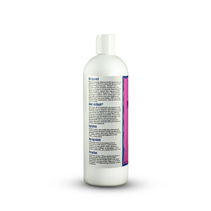 Precious puppies deserve tender loving care, so earthbath® crafted this ultra-mild shampoo just for your frisky young pup. Tearless* and pH-balanced for puppies’ sensitive skin, this luxurious shampoo contains the finest blend of gentle cleansers, organic aloe vera and a dash of baby-fresh cherry fragrance. This shampoo will create a brilliant, show quality shine, rinse thoroughly and leave your pup smelling and feeling better than ever before. Will not wash off topical flea applications. Safe for all animals over 6 weeks.