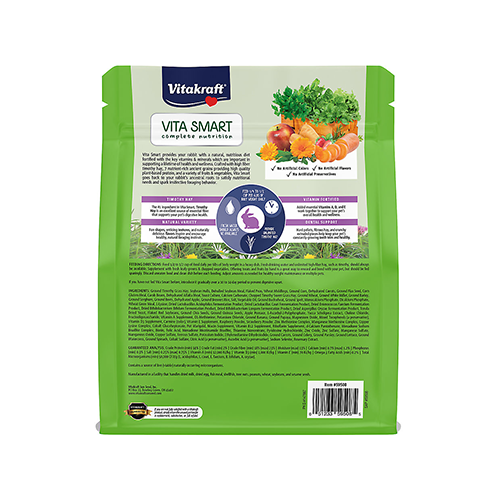 Vita Smart provides your rabbit with a natural, nutritious diet fortified with the key vitamins and minerals which are important in supporting a lifetime of health and wellness. Crafted with high fiber timothy hay, 7 nutrient-rich ancient grains providing high quality plant-based protein, and a variety of fruits & vegetables, Vita Smart goes back to your rabbit's ancestral roots to satisfy nutritional needs and spark instinctive foraging behavior.